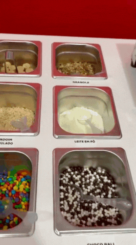 Cereja, confete, choco ball, amendoim granulado, leite em Pó, leite condensado, paçoca, brigadeiro, negresco triturado, gominhas amorinha e bananinha, canudinho wafer, granulado colorido e granulado brigadeiro